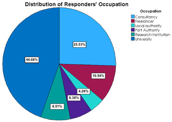 Overall, 47 answers were taken into consideration from different fields (academia, research institutions, port and marina management, central and local authorities, and relevant consultancies). The response rate was around 65% of total invitations. The distribution of responders’ occupations is shown in Figure 2.
