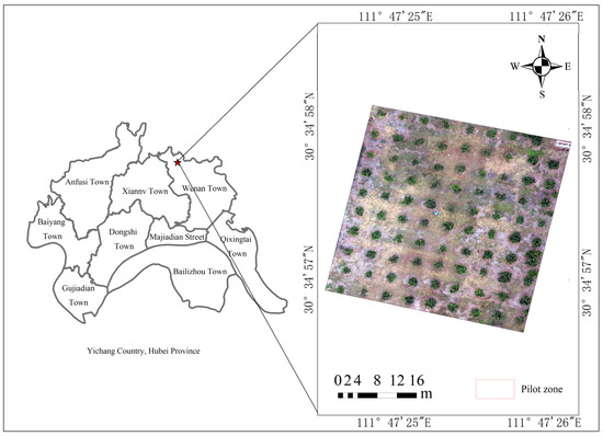This experiment was conducted at the Zhijiang experimental field of the Yichang Institute of Agricultural Science, Hubei Province, at latitude 30°58.26′ N and longitude 111°79.05′ E, as shown in Figure 1. The fruit tree variety studied was the Newhall navel orange, with the fruit trees spaced 4 m × 4 m apart within the 28 m × 28 m experimental orchard. The growth of the fruit trees was generally consistent. The lowest point of the experimental orchard was 89 m above sea level, while the highest point was at 92 m above sea level, resulting in a height difference of approximately 3 m. The region’s climate is classified as subtropical monsoon humid, characterized by four distinct seasons, the simultaneous presence of water and heat, an annual frost-free period of 271 days, an average annual rainfall of 1019 mm, and annual sunshine hours of 1895.7 h. The average annual temperature is 16.9 °C, with an annual extreme maximum temperature of 39.3 °C, and an annual extreme minimum temperature of −14.8 °C. This climate is suitable for citrus planting and growth.
