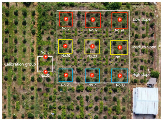 To mitigate any border influence, the experimental area was positioned in the center of the citrus orchard, with two longitudinally aligned spacing areas of 8 m between each experimental group and four spacing rows between the three groups. This layout aimed to minimize the impact of measurement data between each experimental group. Three categories for primary planting slopes of citrus—top slope, medium slope, and bottom slope—were established. The difference in planting height between the top slope and bottom slope was approximately 3 m, with a 15° slope. Three replicates were instituted for each treatment to ensure result accuracy.