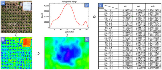 Flow chart of the spectral data extraction. Note: (a) Color composite image of the experimental area. (b) UAV multispectral image. (c) UAV multispectral image element. (d) UAV multispectral image element data statistics (the horizontal coordinate was the DN value of the image element and the vertical coordinate was the statistical value of the number of image elements). (e) Multispectral data extraction table.