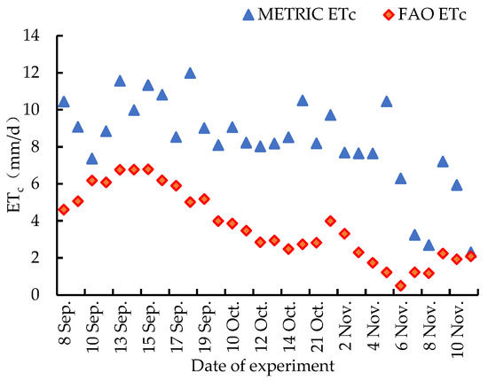Figure 4 depicts the ETc change process of the Newhall navel oranges in two growth periods simulated using the METRIC model and P-M formula (average ETc of the whole experimental area). The lowest value of ETc estimated based on the METRIC model was 2.30 mm/d during the color change and sugar increase period, while the highest value was 11.98 mm/d during the fruit expansion period.