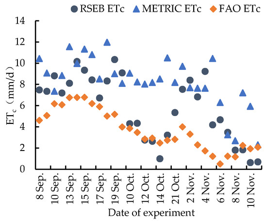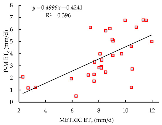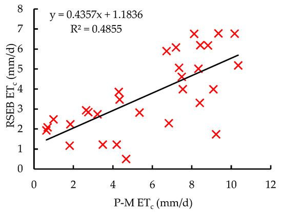 Figure 9 indicates a clear difference in the values of the ETc estimated by the three methods. The values estimated by the METRIC model were much larger than those estimated by the remaining two methods, while the values estimated by the RSEB model were closer to the results calculated by the P-M formula. Consequently, the RSEB model was a better choice than the METRIC model for estimating the ETc in citrus zones using UAV multispectral remote sensing.