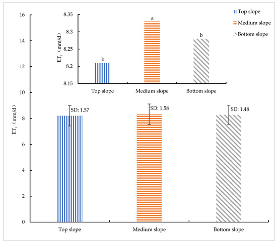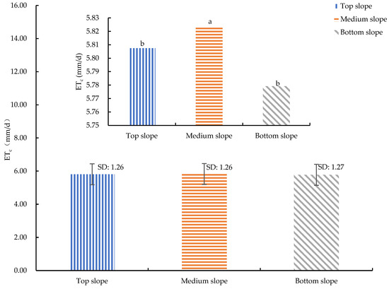 Average RSEB ETc for each treatment. Note: Different lowercase letters represent significant differences in ETc at the p < 0.05 level for different slopes.