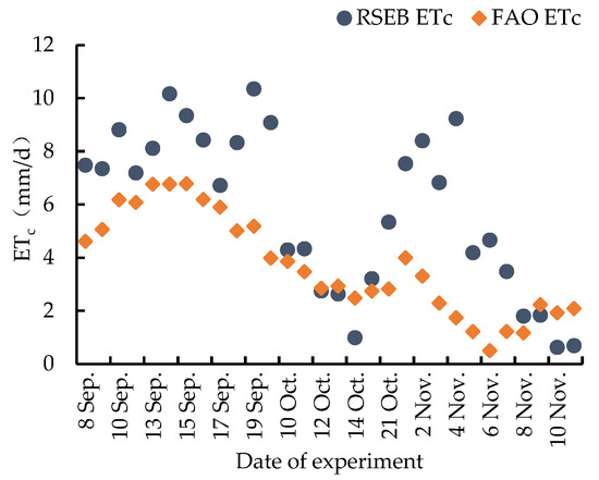 Figure 7 illustrates the changes in ETc of the Newhall navel oranges during the two growth periods, as estimated by the RSEB model and P-M formula. The lowest value of ETc based on the RSEB model was 0.63 mm/d at the end of the color change and sugar increase period (close to the fruit-picking period), with the highest value being 10.35 mm/d during the fruit expansion period.