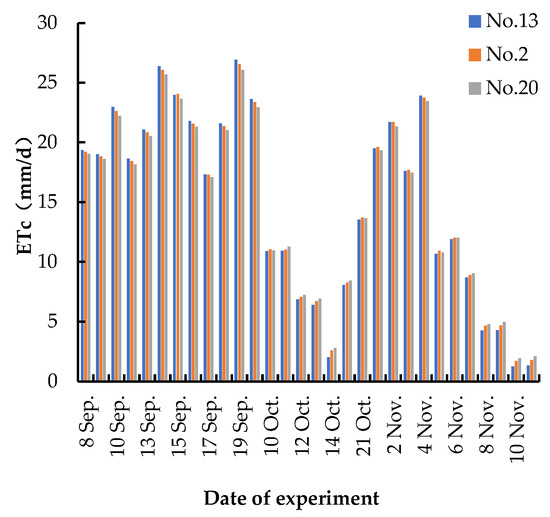 The estimation method of G that introduces multispectral data can better take into account the effect of vegetation on ETc, and the scope of application was also wider [36]. In order to make the estimation method applicable to the field experimental environment at a higher level, Equation (4) was chosen for the calculation of G in this experiment.