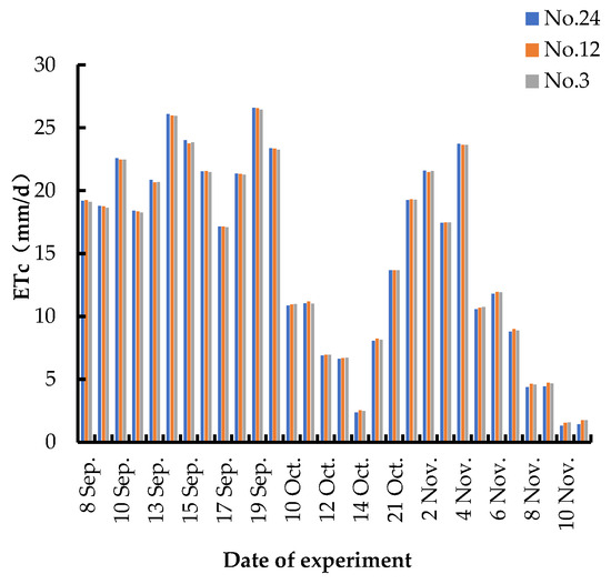 Using the modified RSEB model (0.64 RSEB) in a time series, the four trees were divided into a group of nine sets of three different treatments, and the results of the inversion of ETc from citrus fields in the top slope treatment (No. 13, No. 2, No. 20), the medium slope treatment (No. 1, No. 23, No. 10), and the bottom slope treatment (No. 24, No. 12, and No. 3) are shown in Figure 11, Figure 12 and Figure 13.