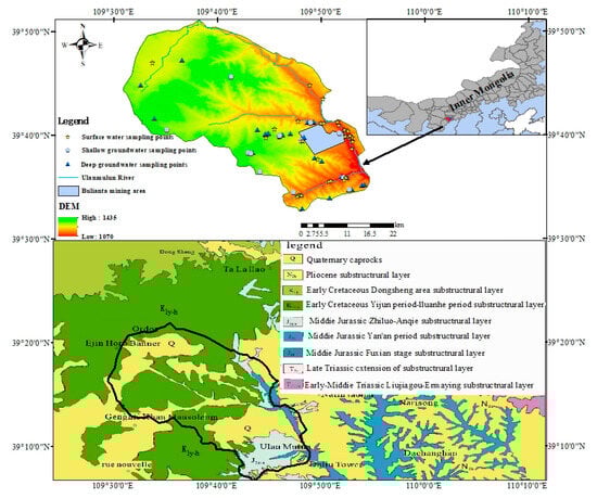 Water is essential for sustaining ecosystems and for human life and social development []. However, accelerated industrialization and the associated increases in human population and human activities since the 20th century have led to the pollution of freshwater sources [,,,]. Ordos Basin falls in the arid and semi-arid northwestern China, characterized by large coal and petroleum resources []. While the exploitation of coal resources has facilitated economic development, it has also resulted in several environmental challenges, including environmental pollution, land subsidence, aquifer destruction, and ecological damage.