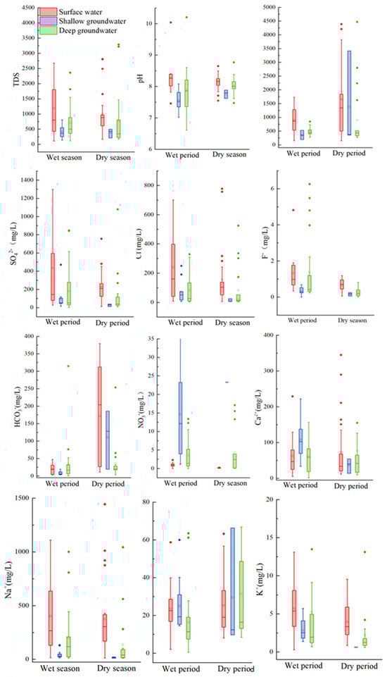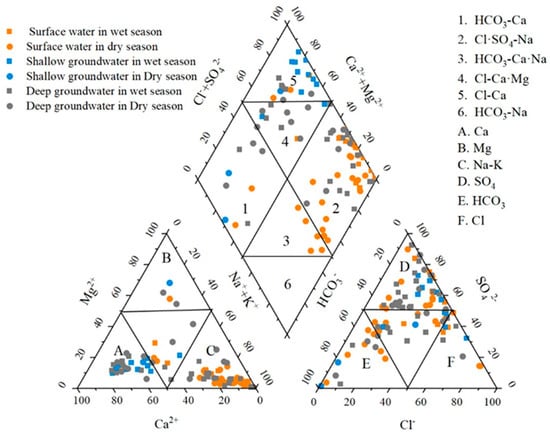 The percentages of anions by total anion mass varied between the different water bodies and between the wet and dry periods (Figure 2). The rank of anions in surface water, shallow groundwater, and deep groundwater during the wet period according to the relative proportion of total mass was SO42− > Cl− > HCO3− > NO3−, with SO42− accounting for 51.27%, 59.40%, and 62.42% of the total anions in shallow groundwater, deep groundwater, and surface water, respectively. This result suggests that anions in all three water types may be regulated by accelerated oxidation of pyrite introduced by coal mining. The rank of cations in surface water and deep groundwater according to the relative proportion of total mass was Na+ > Ca2+ > Mg2+ > K+; that in shallow groundwater was Ca2+ > Na+ > Mg2+ > K+. Among the cations, Na+ accounted for 80.49% and 70.92% of total cations in surface water and deep groundwater, respectively; Ca2+ accounted for 60.21% of total cations in shallow groundwater. The rank of anions of surface water during the dry period according to relative proportion of total mass was SO42− > HCO3− > Cl− > NO3−; that of shallow groundwater was SO42− > Cl− > NO3− > HCO3−. Given the limited depth of shallow groundwater, chemical constituents of shallow groundwater were strongly influenced by anthropogenic activities, with high concentrations of NO3− detected in a small number of samples. The rank of anions of deep groundwater according to the relative proportion of total mass was SO42− > Cl− > HCO3− > NO3−; that of cations of surface water and deep groundwater was Na+ > Ca2+ > Mg2+ > K+; that of cations of shallow groundwater was Ca2+ > Mg2+ > Na+ > K+. Na+ accounted for 78.47% and 55.13% of the total cations in surface water and deep groundwater, respectively; Ca2+ accounted for 43.72% of the total cations in shallow groundwater, mainly originating from the dissolution of carbonate minerals [].