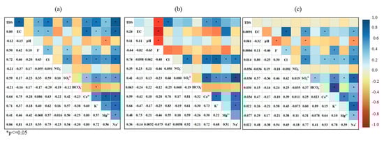 Correlation analysis (CA) is a statistical method used to measure the degree of correlation between different variables. CA allows a visual representation of the degree of correlation between different water chemistry indicators. Pearson’s correlation coefficients (r) were calculated between 12 variables (TDS, EC, pH, F−, Cl−, NO3−, SO42−, HCO3−, Ca2+, K+, Mg2+, and Na+) for the 40, 14, and 42 surface water, shallow groundwater, and deep groundwater samples from the study area, respectively (Figure 4).
