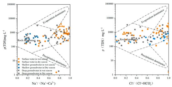The Gibbs plot can isolate water samples according to the three major processes influencing water hydrochemistry, namely evaporative-concentration-dominated, rock-weathering-dominated, and atmospheric-precipitation-dominated. The Gibbs plot consists of two sets of scatter plots with semi-logarithmic coordinates that plot the ratio of Cl−/(Cl− + HCO3−) or Na+/(Na+ + Ca2+) in the horizontal coordinates and TDS in both vertical coordinates.