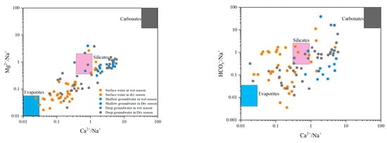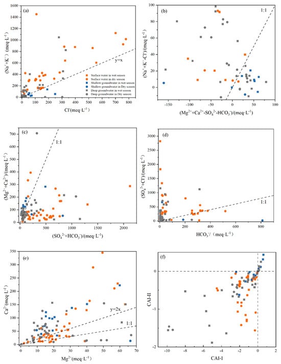 The major ion ratios were plotted for the sampling points for the different water bodies in the study area during the wet and dry periods (Figure 6). The ion ratio relationship diagram could be used to analyze sources of major ions, with the source of Na+ + K+ and Cl− distinguished by the (Na+ + K+)/Cl− relationship in Figure 7a. The results showed that rock salt mineral dissolution occurred when the ratio of (Na+ + K+)/Cl− was close to 1, whereas silicate mineral dissolution occurred when the ratio of (Na+ + K+)/Cl− exceeded 1. As shown in Figure 7a, surface water and deep groundwater sampling points during the wet and dry periods mostly plotted above the y = x line. This result indicates that Na+ and K+ originate from the dissolution and filtration of evaporated rock salts and silicates as well as from other sources, and may also be affected by other processes, such as anion and cation exchange. Anion and cation exchange effects may be influenced by the dissolution and filtration of rock salts and silicates. Anion exchange can be identified by the (Na+ + K+ − Cl−)/((Ca2+ + Mg2+) − (SO42− + HCO3−)) relationship, with a ratio close to −1 indicating a cation exchange effect. As shown in Figure 7b, the samples of surface water, shallow groundwater, and deep groundwater showed negative (Na+ + K+ − Cl−)/((Ca2+ + Mg2+) − (SO42− + HCO3−)) relationships. In addition, this relationship in the water samples was more dispersed, suggesting the presence of the ion exchange effect. A (Ca2+ + Mg2+)/(HCO3− + SO42−) ratio close to 1 indicates that Ca2+ and Mg2+ originated from carbonate and silicate dissolution. As shown in Figure 7c, the (Ca2+ + Mg2+)/(HCO3− + SO42−) ratios for most of water sampling points of deep groundwater and shallow groundwater were = 1. Ca2+ and Mg2+ in the groundwater of the study area originate from gypsum dissolution. The ratio of (Ca2+ + Mg2+)/(HCO3− + SO42−) for surface water diverged away from 1, indicating weak exposure to gypsum dissolution, mainly from silicate dissolution. As shown in Figure 7d, most water sample points were plotted above the 1:1 line, indicating evaporite dissolution filtration. A small proportion of the water sample points plotted below the 1:1 line, suggesting regulation of water chemistry by dissolution filtration of carbonate minerals. As shown in Figure 7e, groundwater Ca2+ and Mg2+ were regulated by the joint effects of calcite, dolomite, and silicate dissolution. The Ca2+/Mg2 ratio of a small proportion of water sample points plotted below 1, with almost no groundwater sample points falling between 1 and 2 and most falling above 2. The above results suggest that groundwater Ca2+ and Mg2+ mainly originate from silicate dissolution and calcite dissolution [].