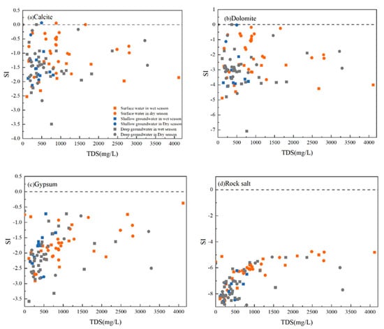 The changes in SI can be used to identify the different stages of groundwater chemistry. The Phreeqc Interactive 3.7.3 simulation software was used to simulate the SI of calcite, dolomite, gypsum, rock salt, and other common soluble salt minerals in different water bodies in the study area during the wet and dry periods. As shown in Figure 8, small proportions of surface water, shallow groundwater, and deep groundwater during the dry period exhibited calcite and dolomite saturation, whereas most remained in an unsaturated gypsum and rock salt state. These results indicated complex chemical genesis of the water bodies in the study area, with large influences from anthropogenic factors.