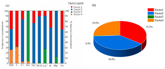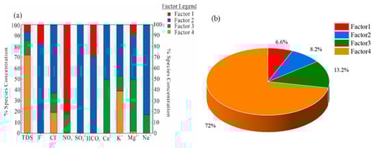 As shown in Figure 9, the source of the main chemical indicator (factor 1) in surface water, NO3− (82.6%), was excessive application of nitrogen agricultural fertilizers, in general agreement with other studies []. In addition, factor 1 was strongly influenced by agricultural fertilizer, with an average contribution of 6.6%. The main ions contributing to factor 2 were F−, Cl−, SO42−, HCO3−, K+, and Na+, with relative contributions of 83.2%, 62.5%, 100%, 70.8%, 48.2%, and 82.8%, respectively. Surface water was dominated by the SO4-Cl-Na and HCO3-SO4-Na types. The dominance of Na+ among surface water cations could be attributed to the dissolution of silicate minerals and rock salt minerals. In addition, factor 2 represented primary geological action [], with an average contribution of 8.2%. Since Ca2+ (48.6%) and Mg2+ (49.2%) were the main ions of factor 3, this factor represented rock weathering, with an average contribution of 13.2%. TDS (72%) and K+ (39.3%) were the main ions of factor 4, with this factor dominating the hydrochemistry of surface water (72%).