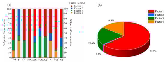Figure 11 shows the results of source identification of chemical indicators in shallow groundwater. The main ions contributing to factor 1 were TDS, Cl−, SO42−, Ca2+, K+, Mg2+, and Na+. Among them, NO3− showed the highest contribution. Previous studies have indicated that frequent industrial activities lead to an increase in NO3− []. Factor 1 represented human activities, with the highest average contribution to the hydrochemistry of shallow groundwater of 63.9%. F− was the main (54.8%) characteristic ion of factor 2 and originated from the dissolution of silicate. Therefore, factor 2 represents primary geological action, with an average contribution of 0.7%. HCO3− and Ca2+ are the main ions of factor 3, whereas at the same time, shallow groundwater was dominated by the HCO3-Ca water type. In addition, the hydrochemistry of shallow groundwater was influenced by the dissolution of gypsum and silicate as well as calcite. These results suggested that factor 3 mainly represented rock weathering, with an average contribution of 20.6%. The characteristic ions of factor 4 were F− and K+, with the average contribution of factor 4 of 14.8%.