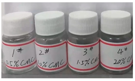 The rheological properties of CMC solution were determined using the Anton Paar MCR302 Advanced Rheometer. Figure 1 shows the four groups of CMC solution samples to be tested, and Figure 2 shows the Anton Paar MCR302 Advanced Rotational Rheometer. Rheological data for CMC solutions with concentrations of 0.5%, 1.0%, 1.5%, and 2.0% were measured using the rheometer and are shown in Figure 3. Due to the measurement principle of the rheometer, the data sampling points are evenly distributed on a logarithmic scale of the abscissa. It can be noted that different concentrations of CMC solutions exhibit significant differences in viscosity at low shear rates. However, when the shear rate exceeds 0.1/s, the differences become extremely small. Therefore, by converting the viscosity coordinates into a logarithmic scale, the differences in viscosity of CMC solutions at higher shear rates can be observed. From the double logarithmic coordinate data plot, it is evident that the viscosity of CMC solutions is positively correlated with the solution concentration, and the trend of viscosity variation with shear rate is also very similar for different concentrations of CMC solutions.