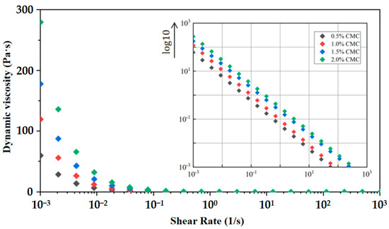 Combining the widely used power-law model in the non-Newtonian viscosity model [20,21], the constitutive equations for CMC solutions with concentrations of 0.5%, 1.0%, 1.5%, and 2.0% were constructed. The specific equations are as follows: