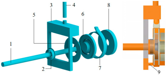 3D model of fluid domain. 1—Inlet Pipe, 2—Clearance of Wear-rings, 3—Air–Liquid Separation Chamber, 4—Outlet Pipe, 5—Volute Front Cavity, 6—Impeller, 7—Volute Casing, 8—Rear Cavity, 9—Reflux hole.