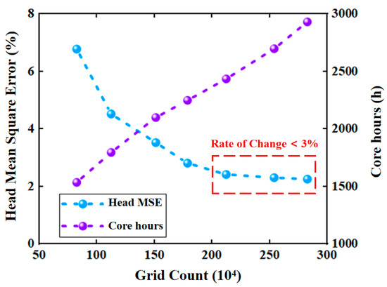 In most numerical simulation studies of centrifugal pumps, the quality of the grid is validated using head or efficiency. However, sometimes the difference between head and efficiency is small. Therefore, this paper used a more intuitive metric, the mean square error (MSE), to assess grid quality [17,22]. Additionally, the computational resources required for simulation were recorded. MSE and computational time were used as criteria for selecting grid schemes. The specific formula for calculating MSE is as follows: