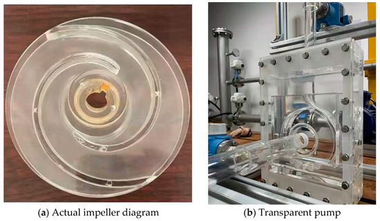 This paper conducted external characteristic tests and simulation calculations for 10 different flow conditions of the test pump. Figure 8 shows the transparent pump used in the experiment, while Figure 9a depicts a schematic diagram of the experimental setup, and Figure 9b shows a photograph of the experimental setup. The inlet and outlet of the test rig are equipped with gate valves and pressure sensors. The gate valve at the outlet is used to adjust the flow rate during the experiment. Pressure sensors installed at the inlet and outlet provide pressure readings, allowing for the calculation of the head of the test pump. Additionally, the distribution box is connected to the motor and control computer, enabling control of the motor speed and measurement of the motor power for the efficiency calculations of the test pump.