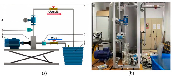 External characteristic test equipment. (a) Diagrammatic sketch of external characteristic test equipment. 1—Electric motor, 2—Test pump, 3,6—Pressure sensors, 4—Electromagnetic flowmeter, 5,7—Gate valves, 8—Water tank. (b) Physical drawing of external characteristic test equipment.