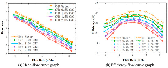 In this experiment, the design flow rate of the pump is 6.5 m3/h, and all data were measured at the rated speed of 1680 rpm. Flow control is achieved by adjusting the gate valve in the outlet pipeline. Inlet pressure, outlet pressure, and flow rate data at different flow rates are obtained from pressure sensors and flow meters at the inlet and outlet. The head and efficiency curves are then calculated based on the motor output power at different flow rates. Since this study investigates CMC solutions of different concentrations, which exhibit varying rheological properties compared to water, the pump performance may vary. Therefore, characteristic tests were also conducted for CMC solutions of different concentrations. Finally, the experiment measured the inlet and outlet pressure values of pure water and 0.5% to 2.0% CMC solutions at flow rates ranging from 4.0 ± 0.1 m3/h to 8.2 ± 0.1 m3/h to calculate the head and efficiency curves for the five groups of test fluids within this flow rate range.