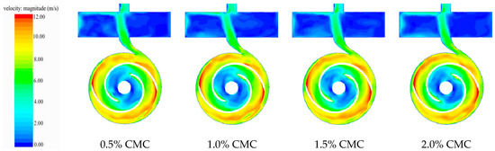 Figure 11 shows velocity contour maps obtained from simulations of the pump using different concentrations of CMC solution as the medium. From the Figure, it is evident that with the high-speed rotation of the impeller, significant high-speed wake flows are generated. The flow near the blade tip approaches the peripheral velocity of the impeller’s outer edge. The areas with lower velocities in the impeller domain are located from the inlet of the impeller to the leading edge of the blade.
