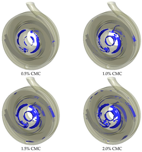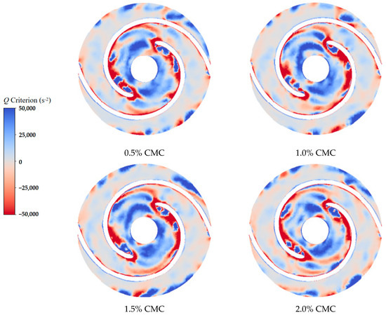 Figure 15 illustrates the vorticity distribution in the impeller region of the pump when simulating with CMC solutions of different concentrations. The vorticity calculation in this figure follows the Q criterion, dividing vorticity into positive and negative values, where positive values represent vortices rotating in the positive direction, and negative values represent vortices rotating in the negative direction. From Figure 15, it can be observed that vortices of different directions are mainly distributed within the impeller of the pump. Positive vortices are concentrated mainly at the edge of the impeller, near the junction with the volute casing. Conversely, negative vortices are predominantly concentrated at the leading edge of the blade suction side. These negative vortices exhibit significant vorticity, indicating a high degree of turbulence in this region. Additionally, upon closer inspection, it can be noted that this area contains a mixture of positive and negative vortices, contributing to the complex flow patterns. Furthermore, this area corresponds to the regions of high velocity observed in the velocity analysis and regions of high negative pressure observed in the pressure analysis. It can be inferred that the generation of vortices within the pump is influenced by the viscosity of the fluid, with an increase in viscosity leading to more numerous and intense vortices within the pump.