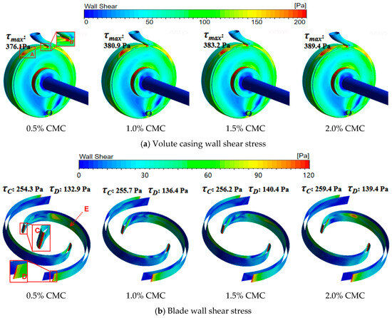 Figure 16 depicts the distribution of wall shear stress on the volute casing and the impeller blades during the simulation process. Firstly, from the shear stress distribution on the volute casing surface shown in Figure 16a, it can be observed that the areas with high shear stress on the volute casing surface are on both sides of the volute outlet and at the tongue position, as indicated by points A and B in the Figure. By examining point A under simulations of different concentrations of CMC solution, it can be noted that with the increasing concentration of CMC solution, along with the increase in viscosity, the shear stress at point A also shows a certain increasing trend. By contrasting the shear stress at point B on the volute tongue, it is evident that with the concentration increasing, the shear stress at point B also slightly increases. Observing the entire front chamber surface of the volute, it can be seen that the circumferential wall surface at the outer edge of the volute experiences higher shear stress, while the shear stress at the middle portion is relatively lower. Furthermore, with the increasing concentration of CMC solution, the shear stress at these middle portions begins to slightly decrease. Additionally, at the bottom of the volute front chamber, due to the presence of the reflux hole, the flow becomes more complex inside the volute, especially above the reflux hole, where the shear stress significantly increases. Moreover, on both sides of the high shear stress region above the reflux hole, there are also areas with extremely low shear stress.