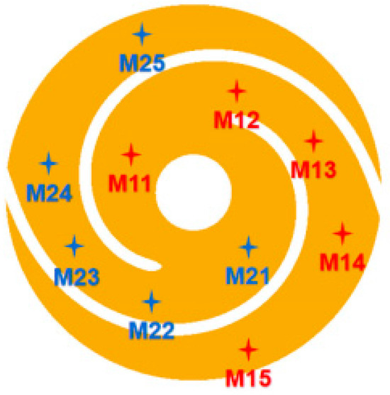 In order to conduct an in-depth study of the internal flow characteristics of the sewage pump, monitoring points were set up within the fluid domain, as shown in Figure 17. Each passage was equipped with five points, namely M11, M12, M13, M14, M15, M21, M22, M23, M24, and M25. By comparing the pressure pulsation at each monitoring point in the two passages, it was found that the pressure pulsation within the two passages was similar. Therefore, the analysis in the following sections focuses only on the pressure at the five monitoring points within a single passage.