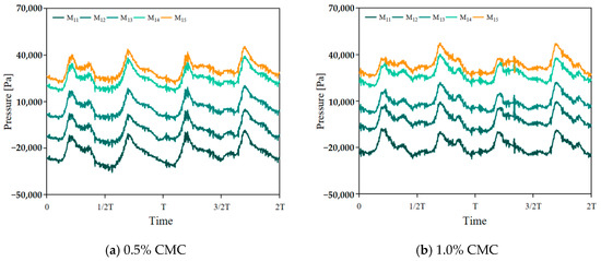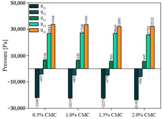 For easier and more intuitive analysis of the pressure variations within the impeller passages at different concentrations, the average pressure fluctuations at each monitoring point were calculated. Figure 19 shows the average pressure fluctuation levels at various monitoring points. From the figure, it can be observed that the flow regions at M11 and M12 are both negative pressure, while those at M13, M14, and M15 show positive pressure. Looking at the average pressure values for the four concentrations of CMC solutions, it is evident that the pressure values are relatively close for each group, but still exhibit a decreasing trend. Comparing the 0.5% CMC solution with the 2.0% CMC solution, the differences at the five monitoring points are 1314 Pa, 916 Pa, 1085 Pa, 1930 Pa, and 1505 Pa, all positive values. This indicates that with an increase in solution concentration, the pressure in various areas inside the pump shows a decreasing trend. By summing the average pressure values at the monitoring points for the 0.5% CMC solution and the 2.0% CMC solution and calculating the rate of change of the difference, a change rate of 16.5% was obtained, indicating significant pressure variations within the passages when there is a difference in concentration.