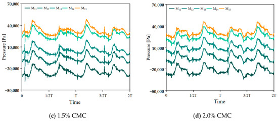 To compare the pressure variations in the internal flow field of the pump when conveying fluids of different viscosities at rated flow, the pressures were monitored at five monitoring points (M11 to M15) within the passages for two rotational cycles of four different viscosity fluid media, as shown in Figure 18. The recording time is one cycle T (T = 3.57 × 10−2 s), which is the time it takes for the impeller to make one revolution. The monitoring time in Figure 18 is 2T. It was observed during the analysis of pressure fluctuations on the impeller that the pressure fluctuation period of the impeller is around 1/2T. Similarly, the monitoring results of pressure fluctuations at the monitoring points in the flow field also exhibit a period of around 1/2T. Therefore, in the fluctuation graph with a monitoring time of 2T, four peaks and four valleys can be observed, with peak values at approximately 40 kPa. Comparing the pressure at monitoring points M11 to M15, it can be noticed that these five monitoring points are arranged sequentially within a passage from the entrance to the exit of the impeller, resulting in a staircase-like increase in pressure values along this sequence.