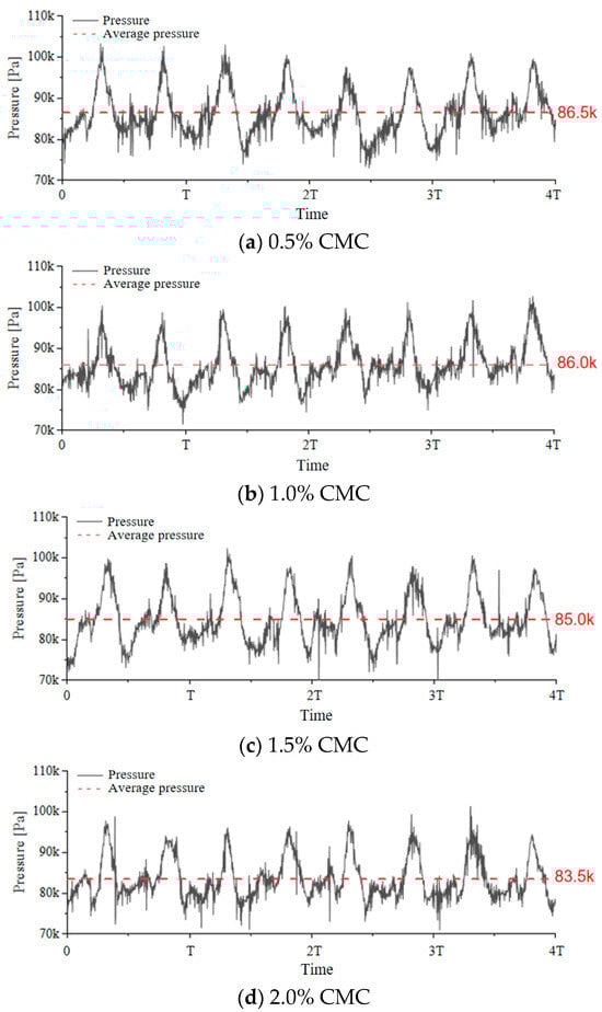 The tongue of a centrifugal pump is a particularly special area, subjected to significant fluid impact and shear stress, thus requiring a more detailed analysis. Figure 20 depicts the pressure fluctuations and their averages at the tongue over a certain period. To obtain a more accurate picture of the pressure fluctuation, monitoring of the pressure fluctuations at the tongue was conducted over a longer time scale, covering four cycles, totaling 3.9684 × 10−4 s. From the pressure monitoring curve in the Figure, it is evident that the pressure fluctuations at the tongue exhibit a very regular cyclic variation over time, with a period of 1/2T, meaning that the tongue undergoes two similar changes within one rotation of the impeller. Comparing the average tongue pressures for the experimental pump using different concentrations of CMC solutions as the fluid medium, it can be observed that the average pressure at the tongue decreases with increasing concentration of CMC solution. When the concentration of the CMC solution is 0.5%, 1.0%, 1.5%, and 2.0%, the average pressures at the tongue are 86.5 kPa, 86.0 KPa, 85.0 kPa, and 83.5 kPa, respectively. The difference between the 0.5% CMC solution and the 2.0% CMC solution is 3.0 kPa, with a change rate of 3.5%.