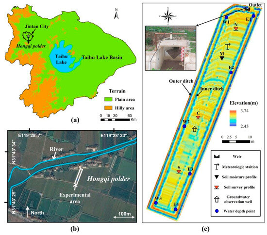 Overview of study area: (a) location of Hongqi polder; (b) location of study area; (c) topography and observation instrument of study area.