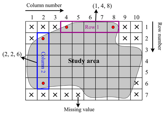 However, the original version of FullSWOF-2D was designed for rectangular areas [61]. We modified the code to make it available for irregular regions. Specifically, a data structure in C++ was set up, which recorded the row number or column number, as well as the serial numbers of the first and last valid cell of this row or column (Figure 2). This data structure marked the boundaries in four directions (i.e., left, right, top, and bottom) in the study area, aiding in the setting of boundary conditions.