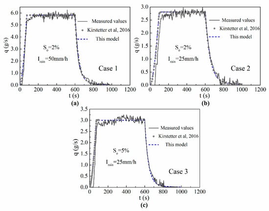 Kirstetter’s artificial rainfall–runoff experiment [67] was selected as a one-dimensional outflow case. The test flume had a length of 4.04 m and width of 11.5 cm. The slope of the flume (So), as well as the artificial rainfall intensity (Irain), could be adjusted manually. The parameters of the three experimental cases are shown in Table 2.