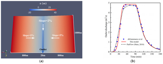 Two–dimensional outflow case: (a) terrain of tilled V-catchment; (b) simulation results of three models, including Giammarco et al. [41], ParFlow [37] and this model.