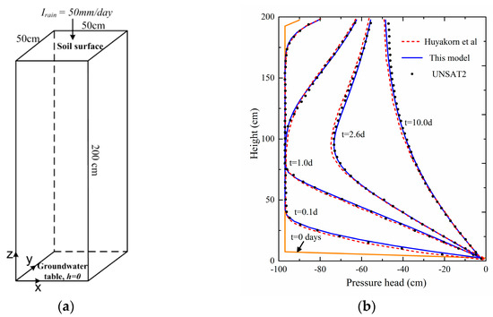 A classical one-dimensional infiltration case was selected [74], which concerned vertical flow in the unsaturated zone. The length and width of the experimental soil column were both 50 cm, and the height was 200 cm. The bottom and top faces corresponded to the groundwater table and the soil surface, respectively (Figure 5a). The soil in this column was homogeneous, the saturated hydraulic conductivity was 10 cm/day, and the porosity was 0.45. The constitutive relations of the soil were: