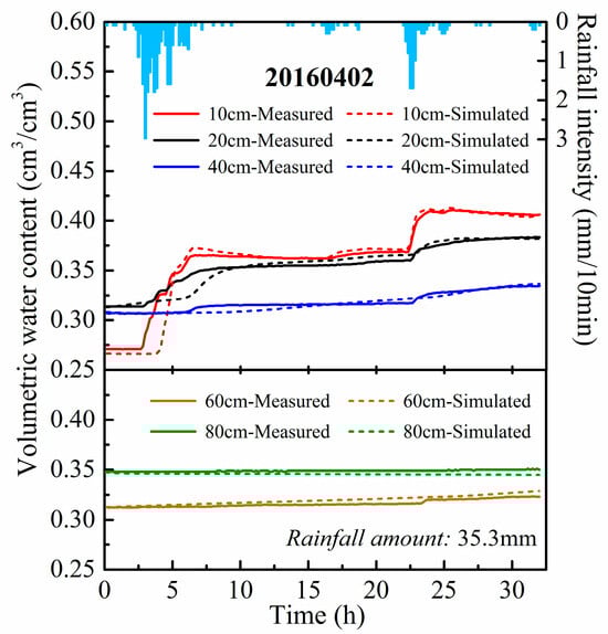 Simulated results of layered soil moisture content in rainfall event 20160402 at experimental field.