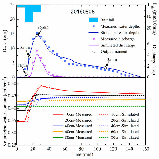 We simulated the rainfall runoff processes of the 20160808 rainfall event, which was known as a typical short-duration rainstorm. The rainfall was 23.7 mm, while the duration of the rainfall was around 30 min. The observed surface runoff was about 4.77 mm. Although fine-resolution DEMs can capture small-scale terrain structural features, they also cause an excessive computational burden. To balance simulation accuracy and efficiency, we chose a 0.3 m-resolution DEM, in which the number of effective discrete surface cells was 10,159 and the elevations varied from 2.73 m to 3.49 m. Hofer et al. [77] selected a similar spatial resolution (0.25 m) in the Chicken Creek basin (440 × 130 m). The elevation of the bottom boundary in the subsurface module was set as 2.29 m. The vertical grid resolution was 1 cm, with 889,052 effective discrete subsurface cells. The surface roughness coefficient was set as 0.02 s/m1/3 according to the range of bare land (0.018–0.06 s/m1/3) [78]. The time step of the subsurface flow module was 0.1 min, and a variable time step was applied in the surface flow module. The CFL factor was set as 0.8. The soil hydraulic parameters of the five layers in Table 3 were also applied in this case. Variables of h, u, v, and q were output every minute. The discharge was calculated from the water depth, using a water depth–discharge relation.