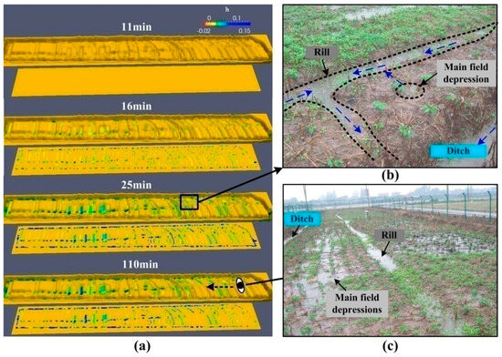 Furthermore, simulated ponding water depths at four typical moments, i.e., the 11th, 16th, 25th and 110th minutes, were output to figure out the characteristics of the runoff generation processes (Figure 8a). At the 11th minute, surface ponding water could only be seen in some scattered depressions in the ditch, with a tiny discharge at the outlet. Five minutes later (i.e., the 16th minute), the ponding water in the ditch increased rapidly. Meanwhile, ponding water could also clearly be found in many depressions in the main field. Subsequently, the discharge reached a peak value at the 25th minute. The surface ponding water depths at this moment were much deeper than those of the 16th minute. Remarkably, some adjacent scattered depressions in the main field connected, forming patches of puddles. These puddles also connected with the rills nearby, which connected with the surrounding ditch. Therefore, the excess surface water in the puddles drained into the ditch through the rills (Figure 8b). After the rainfall, the discharge receded gradually. At the 110th minute, the ponding water close to the outlet receded fastest, due to drainage. The ponding water of the puddles in the main field receded gradually due to infiltration, which made the connections of some puddles break (Figure 8c).