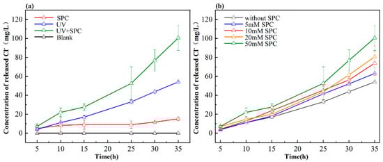 The concentration of released Cl− in PVC MPs is compared between (a) UV and SPC and (b) Different concentrations of SPC and UV only. Conditions: [PVC] = 2.5 g/L.