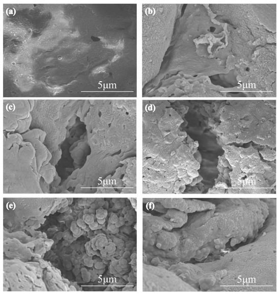 SEM of (a) pristine and (b–f) treated PVC MPs. (b–e) 5 mM, 10 mM, 20 mM and 50 mM SPC with UV, (f) 50 mM SPC + 50 mM PhOH with UV.