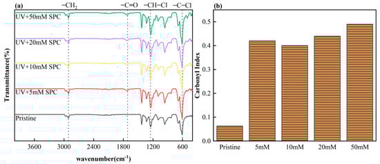 In order to explore the oxidation mechanism and further investigate the dechlorination mechanism of PVC MPs in the UV/SPC system, the functional groups on the surface of PVC MPs were analyzed by FTIR. As shown in Figure 4a, there are two characteristic peaks associated with chlorine on the infrared spectrum of PVC MPs, which appear at 605 cm−1 and 1250 cm−1, respectively, and they are generated by the stretching vibrations of the C-Cl group and the CH-Cl group [44,54]. Another characteristic peak appearing at 2909 cm−1 represents the stretching vibrational signal of methylene (-CH2) [54]. A new characteristic peak at 1715 cm−1 emerged on the spectrum of UV/SPC-treated PVC MPs, attributable to the stretching vibration of the C=O group [43], and the corresponding carbonyl index in Figure 4b demonstrates a significant increase for all treated PVC MPs, indicating that the active species present in the system can oxidize PVC MPs. It can be clearly observed that the signal intensity belonging to the C=O group is the strongest when the initial SPC dosage is 50 mM, and the concentration of chloride ions released from PVC MPs is also the highest at the same condition, which suggests that there exists a relationship between the concentration of released Cl− and the degree of oxidation. However, the characteristic peak signals of CH-Cl and C-Cl groups related to chlorine both showed different degrees of enhancement after treatment, which may be related to the inability of oxidizing radicals to attack the C-Cl bond directly. Evidence for this speculation is the very low contribution of oxidizing radicals to dechlorination found by Miao et al., who found 1% dechlorination of PVC MPs in an anode chamber where only oxidizing radicals were present (8–10% in a cathode chamber) [47]. The enhanced signals representing chlorine are due to the increased specific surface area of the treated PVC MPs, resulting in more chlorine-containing groups being detected. In conclusion, the enhancement of the signals at 1250 cm−1 and 605 cm−1 illustrates the inability of oxidizing radicals to release Cl− by selectively breaking the C-Cl bond.