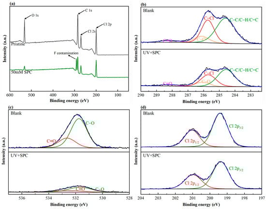 As shown in Figure 5b, the XPS spectrum of C 1s is divided into four peaks, including C=C/C-C/C-H, C-Cl, C-O, and C=O, with binding energies centered at 284.6, 285.7, 286.1, and 288.2 eV, respectively [55,56]. The specific proportion of each peak is shown in Table S3, which shows that the proportion of the peaks representing C-Cl after treatment did not change significantly, which further indicates that the active species within the UV/SPC system cannot directly break the C-Cl bond to release Cl−. As shown in Figure 5c, the XPS spectrum of O 1s is divided into two peaks, including C=O (532.6 eV) and C-O (531.7 eV) [55], and the percentage of the C=O peak is slightly increased after the treatment, but it is not much different from the original PVC MPs, for reasons that are consistent with the total spectrum. In addition, the XPS spectrum of Cl 2p (Figure 5d) is decomposed into two peaks at 201.0 and 199.4 eV [55], which belong to Cl 2p1/2 and Cl 2p3/2, respectively. The reason for the decrease in the total amount of chlorine after the treatment is in line with the reason for the decrease in the total amount of carbon.