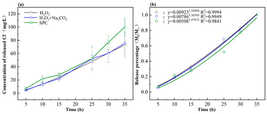 Generally, where and are the amount of Cl− released at time t and equilibrium, respectively, k is the release rate constant, and n is the release index indicating the nature of the release mechanism. In this study, represents the release of Cl− at the end (35 h) of the reaction.