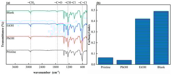 (a) FTIR spectrum and (b) CI value of PVC MPs before and after quenching treatment. Conditions: [PVC] = 2.5 g/L, [SPC] = 50 mM, [EtOH] = 75 mM, [PhOH] = 50 mM.