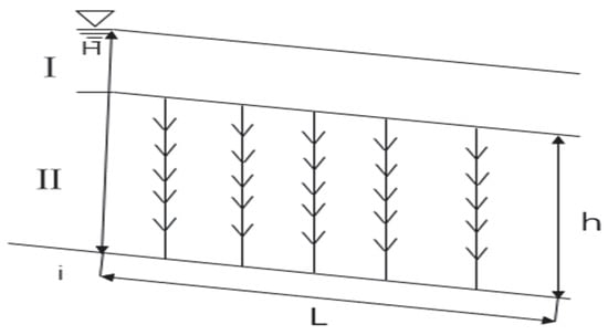 Taking the water body of the plant dam section as the isolation body, establish the coordinates as shown in Figure 4. As the vegetation is submerged, the water depth is much higher than that of the vegetation. We will divide the selected water body into two parts and analyze them separately. is the area above vegetation, and II is the area with vegetation height, as shown in Figure 5 and Figure 6.