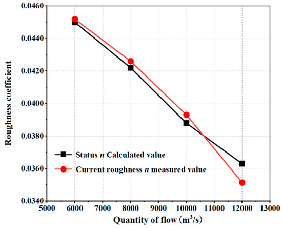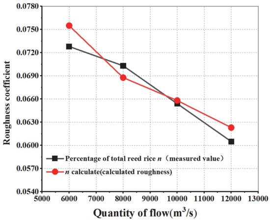From Table 5, it can be concluded that under the full reed condition and in the non-submerged state, the calculated roughness decreases with the increase in flow rate. This pattern is consistent with the conclusion previously derived from experimental data. The data is shown in Figure 8. From Figure 8, it can be seen that the measured roughness values and calculated roughness values match well. Under the same operating conditions, the roughness decreases with an increase in flow rate.