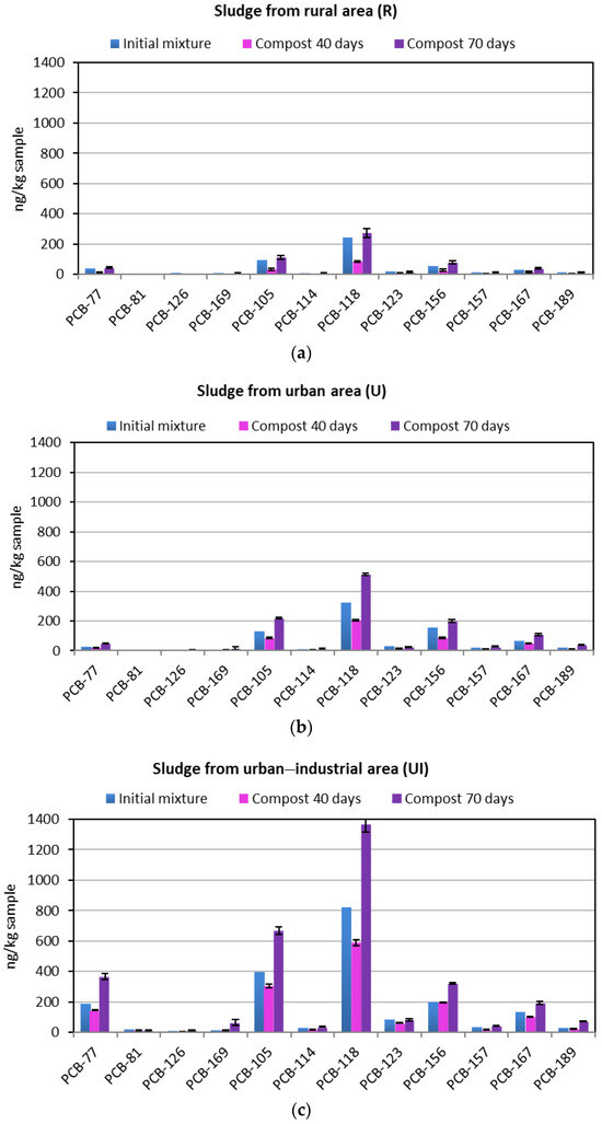 - Lazzari, L.; Sperni, L.; Salizzato, M.; Pavoni, B. Gas Chromatographic Determination of Organic Micropollutants in Samples of Sewage Sludge and Compost: Behaviour of PCB and PAH during Composting. Chemosphere 1999, 38, 1925–1935. [Google Scholar] [CrossRef]