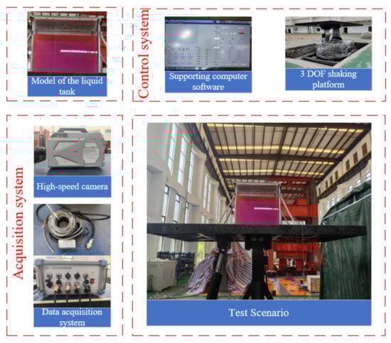 The present model tests were conducted in the Heavy Equipment Laboratory of Jiangsu University of Science and Technology, and the test setup consisted of a rectangular liquid tank, a motion control device, a high-speed camera (Photron (Shanghai) Limited, Shanghai, China), and a data acquisition system.